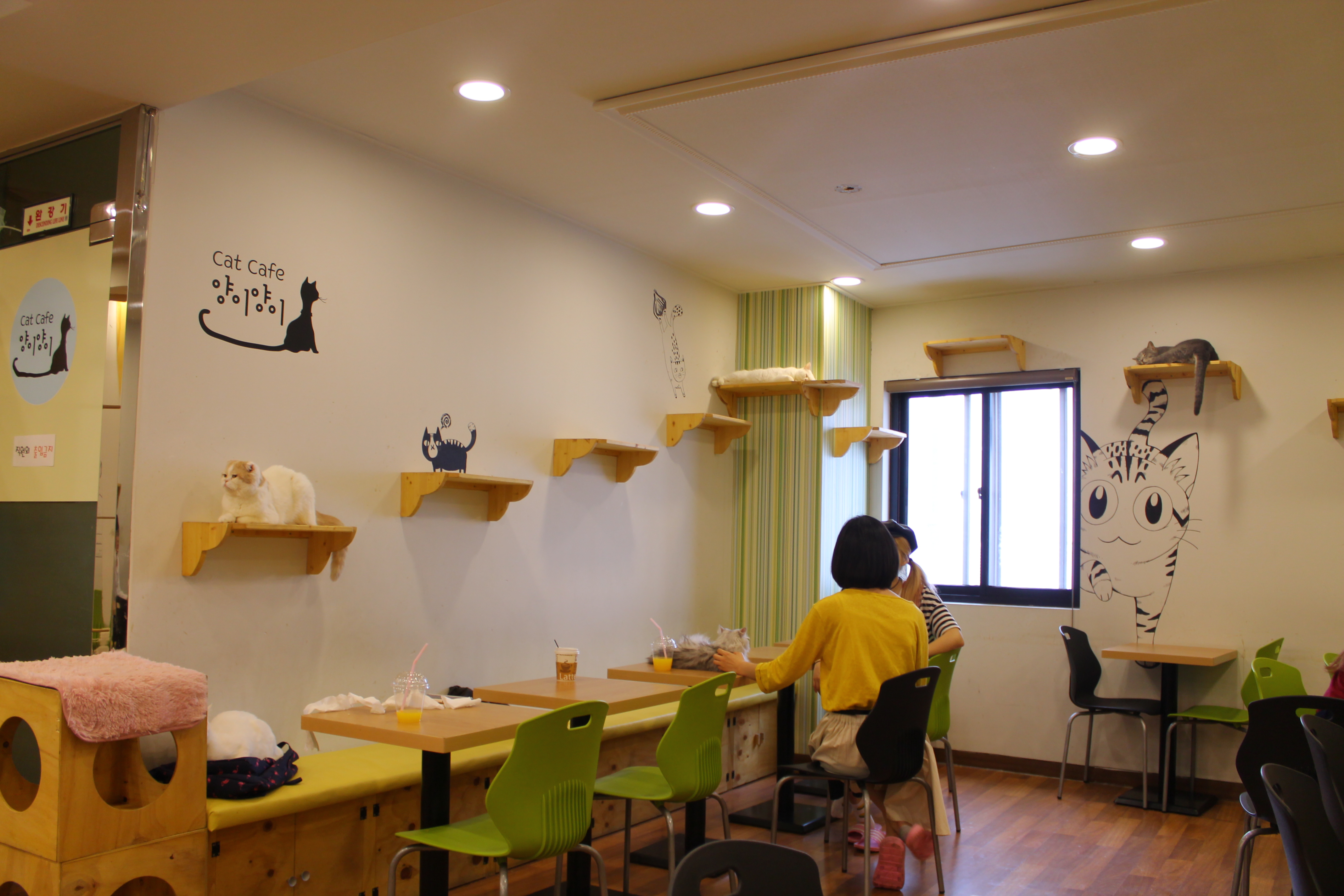 When you go into the cat cafe you take off your shoes and go through the gate. You wash your hands and pay the admission fee (8,000 won or about $8 USD) which includes a drink you select from the menu. Then you are free to roam around or settle wherever you’d like. There are special cat treats you can purchase if you want, but you don’t have to.