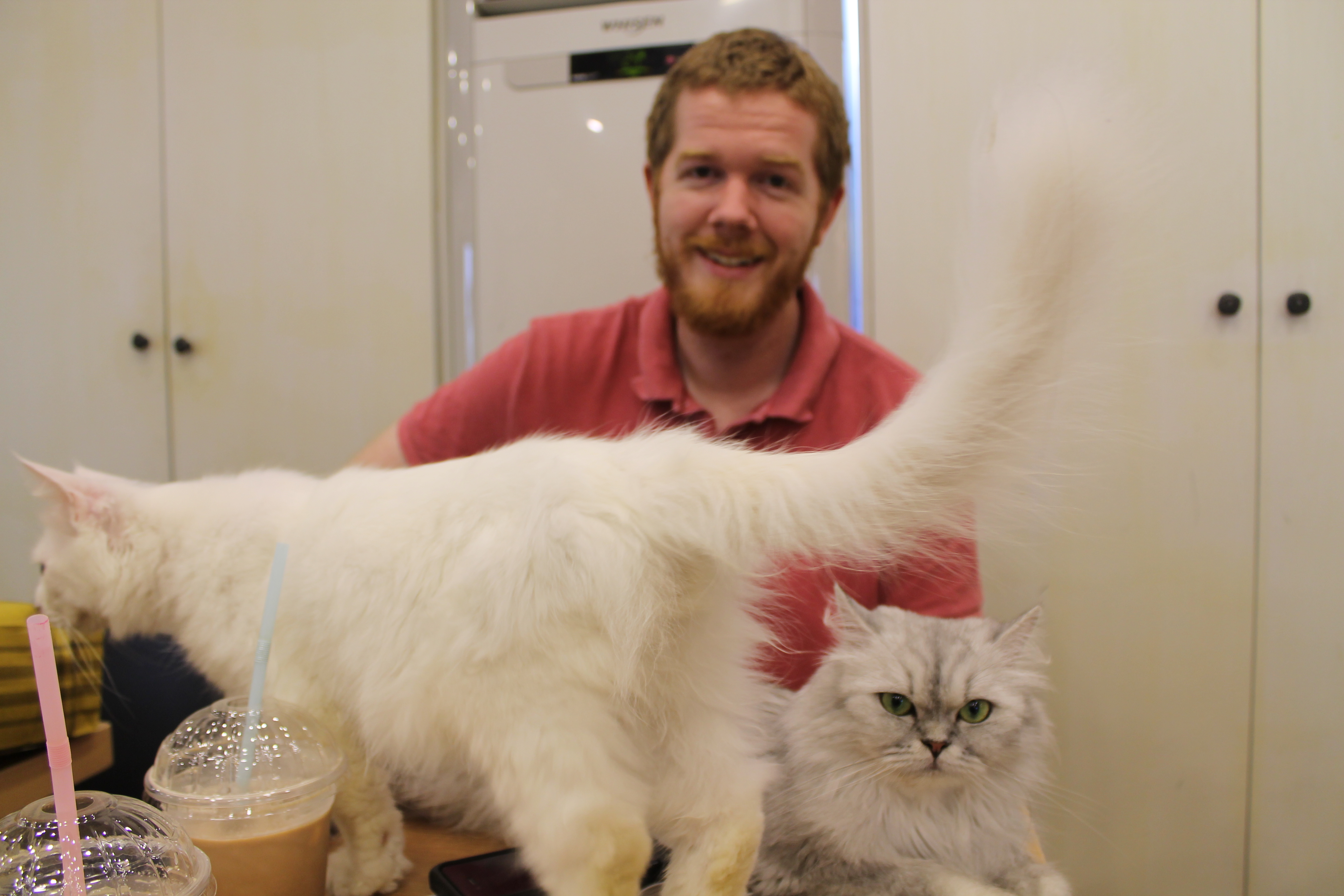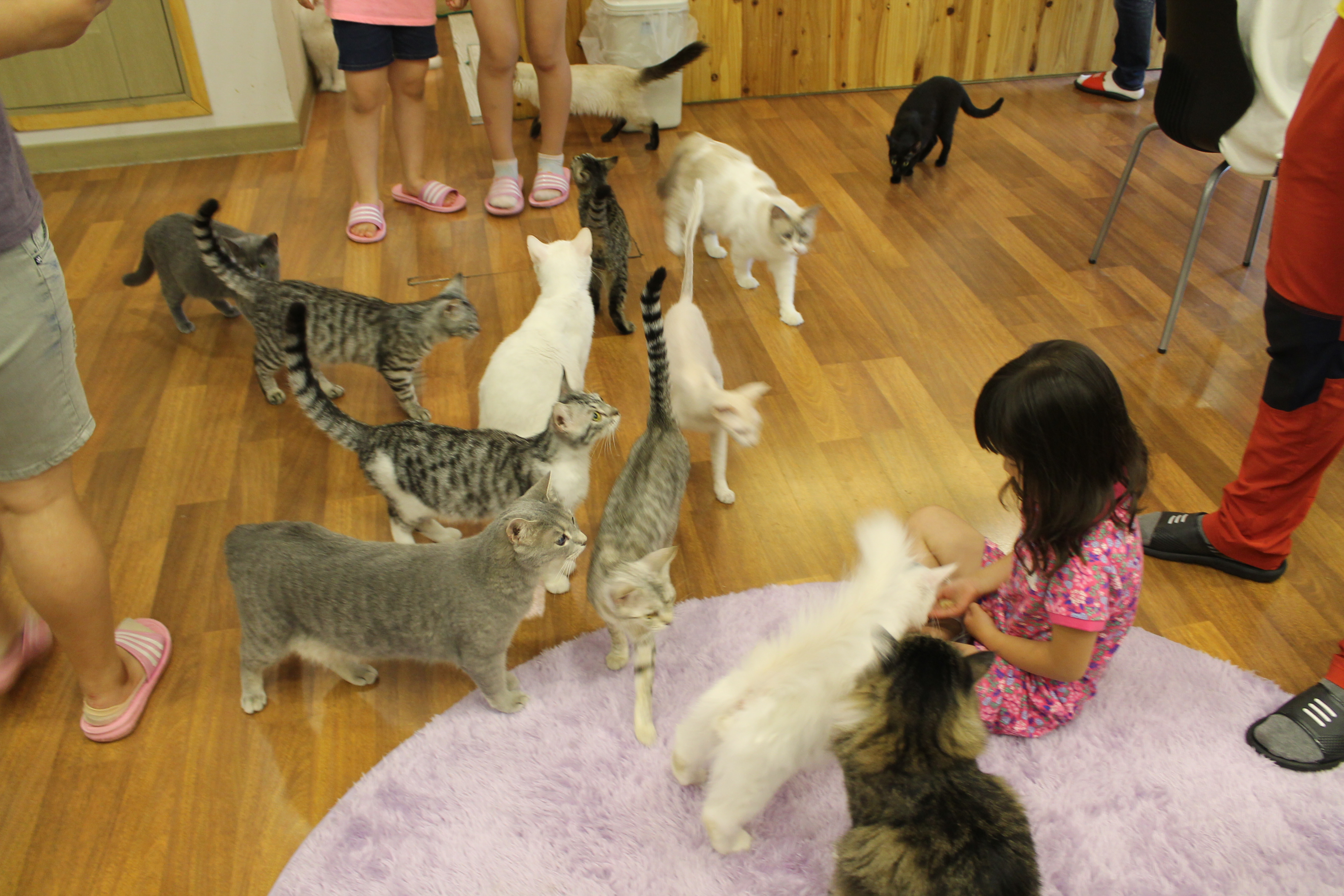 Personally, I prefer the cafes that only have cats. I’ve only been to one that had dogs (the cats and dogs were on separate floors) and I didn’t feel good about the dogs being in that environment. While they were undoubtedly well-fed and received more attention than some dogs, there were simply too many of them in too small of a space and I felt like they needed to be free to run around and to have an owner that cared for them and bonded with them. In contrast, I feel like the cats in the cat cafe are better off than a lot of cats in Korea. Cats aren’t nearly as popular of pets in Korea as dogs are and there are street cats EVERYWHERE so the cats in the cafe actually have a really great life compared to most cats in Korea. I actually saw a dead kitten in the road on my way to school last week which made me so sad. I feel that the cats in the cafes are well fed and they have all the fancy cat trees and cubbies and equipment they could want, so they can decide when they want to interact and can easily get away when they need alone time. They all seem to get along with one another really well and get lots of attention and they are all very gentle.