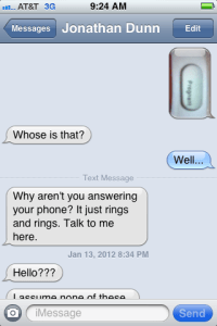 Last weekend I went with Christina to her cousin’s birthday party at a cool restaurant in downtown Raleigh. While I was there I received a text message from a friend who got married a few months ago. The text contained a picture of a positive pregnancy test. I was really excited for her, and also amazed at how quickly they’d gotten pregnant since they’d only been married a short time. I forwarded the picture to Jonathan along with a message that said, “Well…I guess they decided not to waste any time! I just got this text from ‘Monica.’ ” (name changed to protect the innocent.) Then I stuck my phone back in my coat pocket and kept chatting with everyone. About 15 minutes later I realized I never heard back and pulled my phone out again. No messages. I left it on the table and continued with dinner. About three minutes later, my phone started buzzing in uncontrollable spasms. You know when you are in an area with no signal for a while and then you connect again and all the stuff that’s been sent the whole time you were out of signal comes through all at once? Well, that is exactly what had happened. Apparently, back in my coat pocket, things hadn’t been going through. I looked at the screen to find three texts and about 10 missed calls from Jonathan. For a minute I thought, “Geez, why is he so worked up about this…it’s not really even his friend.” Then I looked at the text exchange and found that what I thought I had sent had not all gone through. This is what he had received: