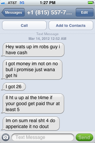 At one in the morning on Tuesday (or I guess Wednesday) I received this long string of texts from a number I don’t know that has an area code for Joliet, IL. For a while I slept through them, but after about 8 texts, this guy started calling. Four times in a row.