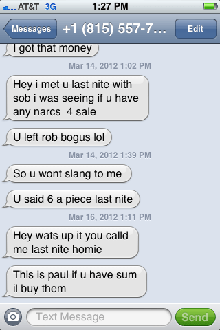 When I get off of work tonight I’m going to go to or call AT&T, explain that they’ve messed something up and also get Paul’s number blocked, I am thinking I’ll go into the AT&T store…I can’t imagine the automated phone system has an option for “If an unauthorized drug deal is being conducted through your phone, please press 5.” But for today I’ve been amusing myself thinking of possible ways I could respond to him.